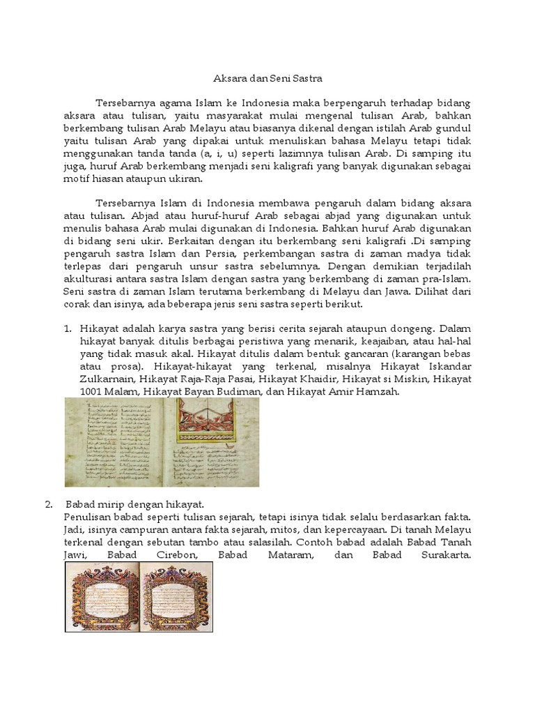Aksara dan Seni Sastra Tersebarnya agama Islam ke Indonesia maka berpengaruh terhadap bidang aksara atau tulisan yaitu masyarakat mulai mengenal tulisan Arab bahkan berkembang tulisan Arab Melayu atau biasanya dikenal dengan istilah Arab gundul yaitu tulisan Arab yang dipakai untuk menuliskan bahasa Melayu tetapi tidak menggunakan tanda-tanda a i u seperti lazimnya tulisan Arab. Ciri-ciri Seni Rupa Islam Di Indonesia Bersifat feodal yaitu kesenian yang bersifat di istana sebagai media pengabdian kepada Raja Sultan. الأدب في الإسلام menurut Said Hawwa adalah seni atau sastra yang berlandaskan kepada akhlak IslamSedangkan menurut Ala al Mozayyen sastra Islam muncul sebagai media dakwah yang di dalamnya terdapat tujuh karakteristik konsistensi pesan universal tegas dan jelas sesuai dengan realita optimis dan menyempurnakan akhlak manusia.