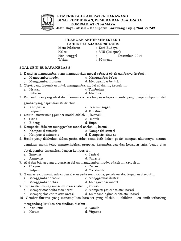 Latihan soal UKK PAT Seni Budaya Kelas 8 SMPMTs Kurikulum 2013 ini untuk membantu belajar peserta didik kelas 8 SMPMTs dalam menghadapi pelaksanaan Ulangan Kenaikan Kelas UKK atau Penilaian Akhir Tahun PAT. Soal UTS Seni Budaya Kelas 8 SMPMTs Genap Baca. Tulis namamu di sudut kanan atas 2.