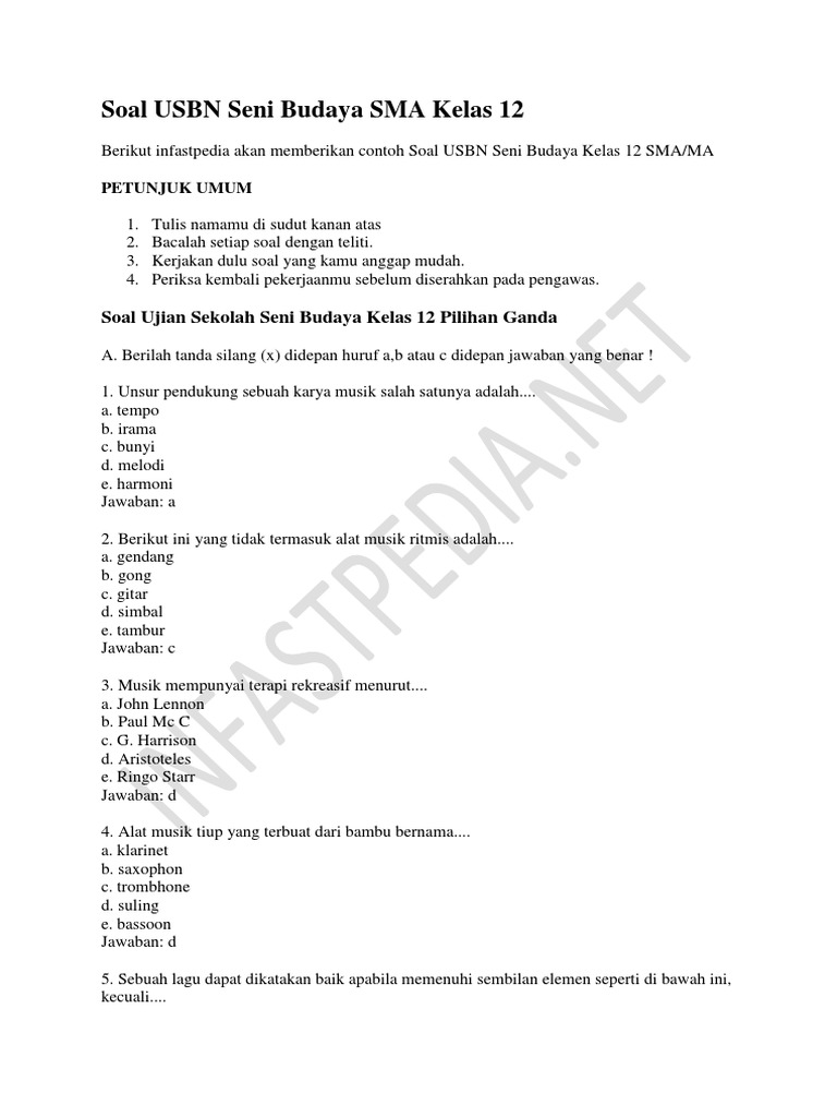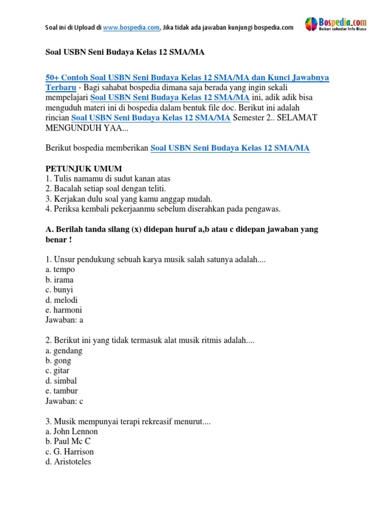 50 Contoh Soal Usbn Seni Budaya Kelas 12 Sma Ma Dan Kunci Jawabnya Docx