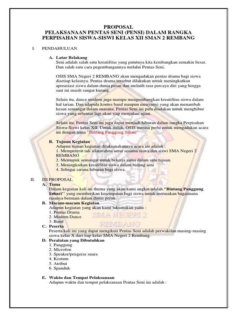 Sehingga pihak yang bertanggung jawab yakin dan mau mengizinkan. Contoh Proposal Kegiatan Acara Pentas Seni - Kali ini admin postingkan contoh proposal kegiatan pentas seni silahkan simak di bawah ini. Contoh Rumusan Masalah Proposal.